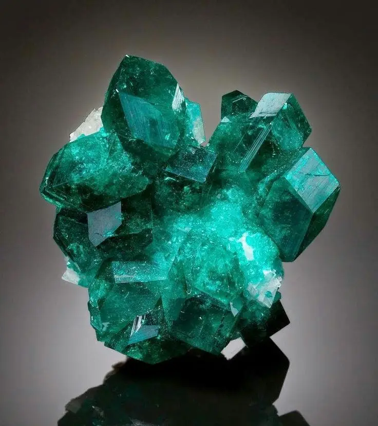 One of the biggest collections we have currently is dioptase. Dioptase is a rare and vibrant emerald-green copper silicate mineral found in arid, oxidized copper deposits, with notable sources in Zambia, Namibia (notably the Tsumeb Mine), Kazakhstan, the Democratic Republic of Congo (DRC), and Arizona (USA). It forms as prismatic or granular crystals, often associated with chrysocolla and malachite.