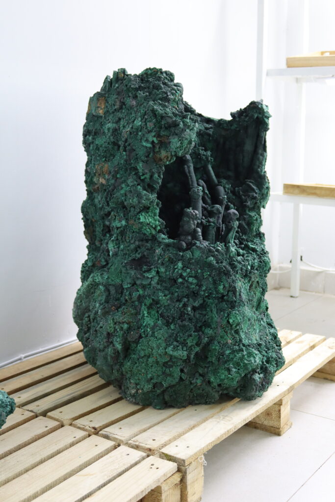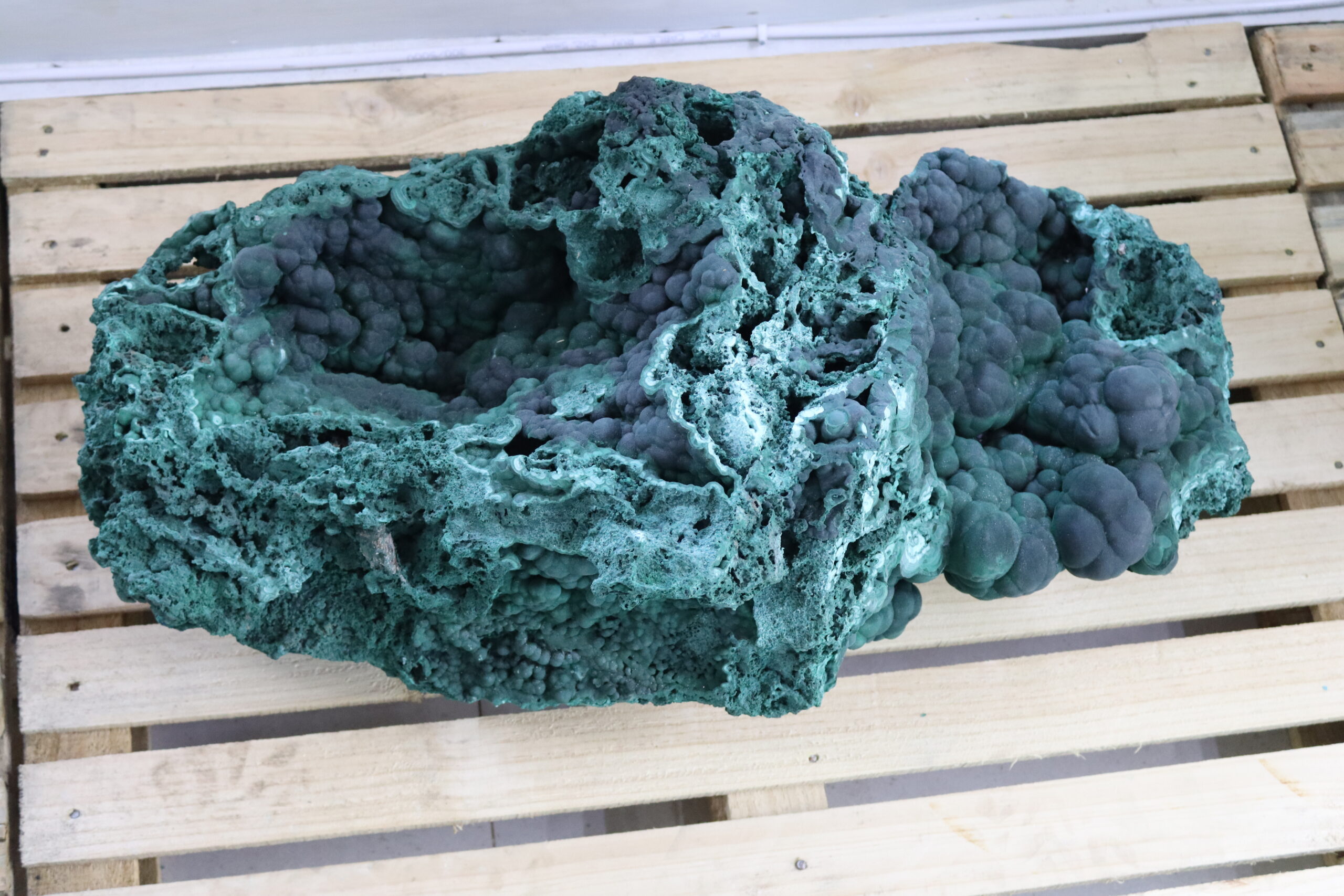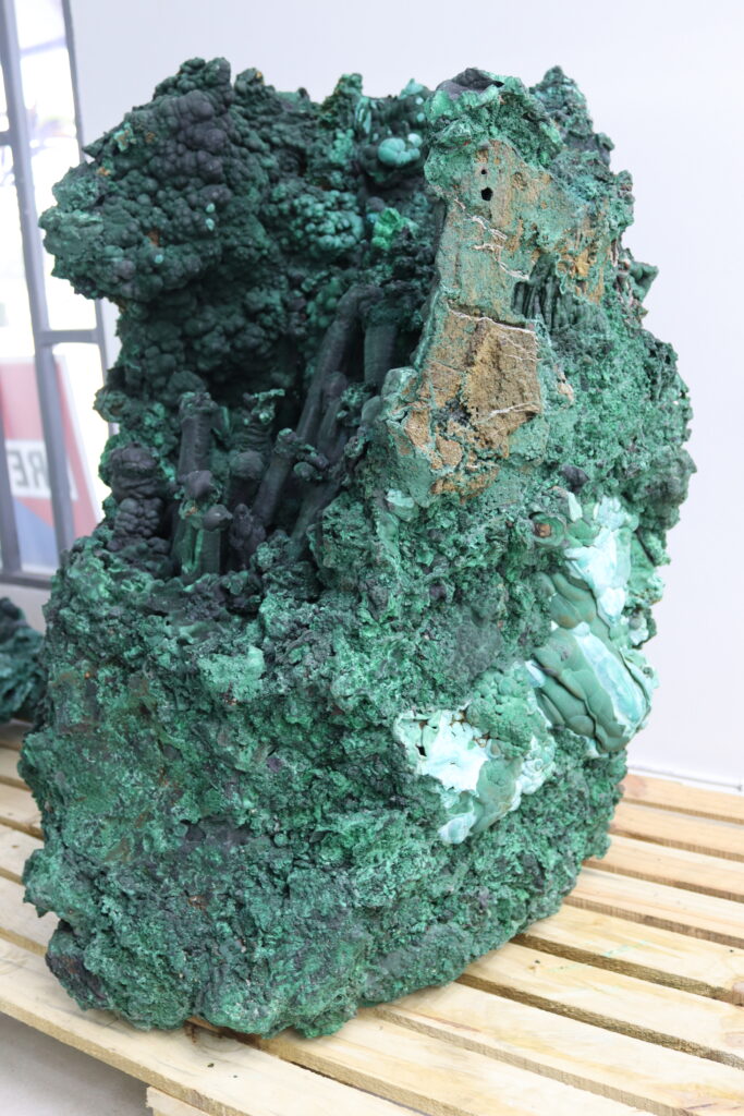 Clocktower Gemstones boasts of some of the largest and rare varieties of malachite specimens, including some with geodes and stalactite. Malachite specimens featuring geodes and stalactites are among the most visually stunning and highly prized formations of this copper carbonate hydroxide mineral. The specimens form in the oxidized zones of copper deposits, where mineral-rich water slowly deposits layers of malachite over time, creating hollow geodes lined with fibrous or botryoidal malachite crystals, or elongated stalactitic structures that grow downward from cavity ceilings. Some of the finest examples come from Zambia, the Democratic Republic of Congo (DRC), Namibia, and Russia’s Ural Mountains, where conditions have allowed for the development of well-defined malachite geodes and striking stalactites.