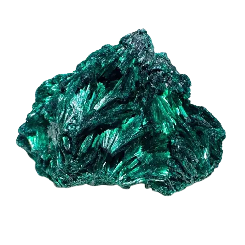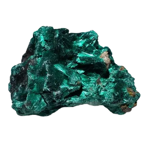 Fibrous malachite is a striking variety of malachite characterized by its fine, radiating needle-like crystals that create a silky or velvety texture. This unique structure results from malachite’s crystallization in tightly packed fibrous aggregates, often forming in the oxidized zones of copper deposits. Major sources of fibrous malachite include Zambia and the Democratic Republic of Congo (DRC). The mineral’s fibrous nature can produce a chatoyant (cat’s-eye) effect when polished, enhancing its visual appeal.