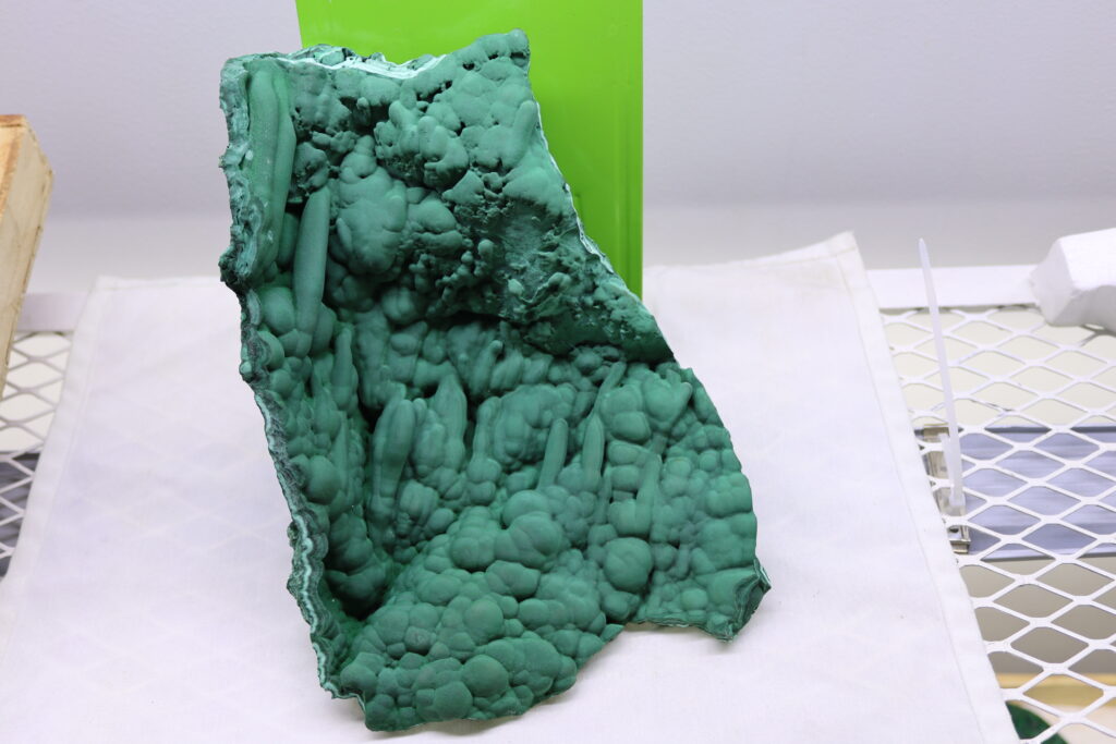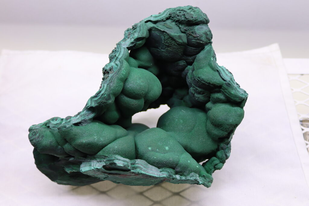 Our pseudo-malachite is usually coated with chrysocolla, a rare and visually striking secondary copper mineral formation found in oxidized copper deposits, particularly in Zambia and the Democratic Republic of Congo (DRC), Namibia, Arizona (USA), and Russia. Pseudo-malachite, a copper phosphate mineral, forms in botryoidal or fibrous masses and is often deep green, while chrysocolla, a copper silicate mineral, coats it with a blue to bluish-green hue, enhancing its aesthetic appeal. This combination results in a vibrant, highly collectible mineral sought after by collectors and lapidary artists. It is sometimes used in jewelry and decorative carvings due to its striking appearance and moderate hardness (4-5 on the Mohs scale). It also holds interest for mineralogists studying supergene mineralization processes in copper-rich environments.